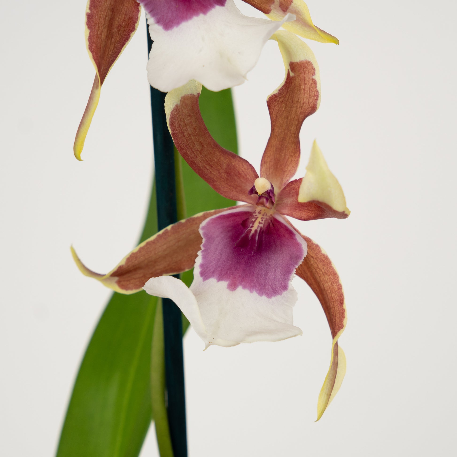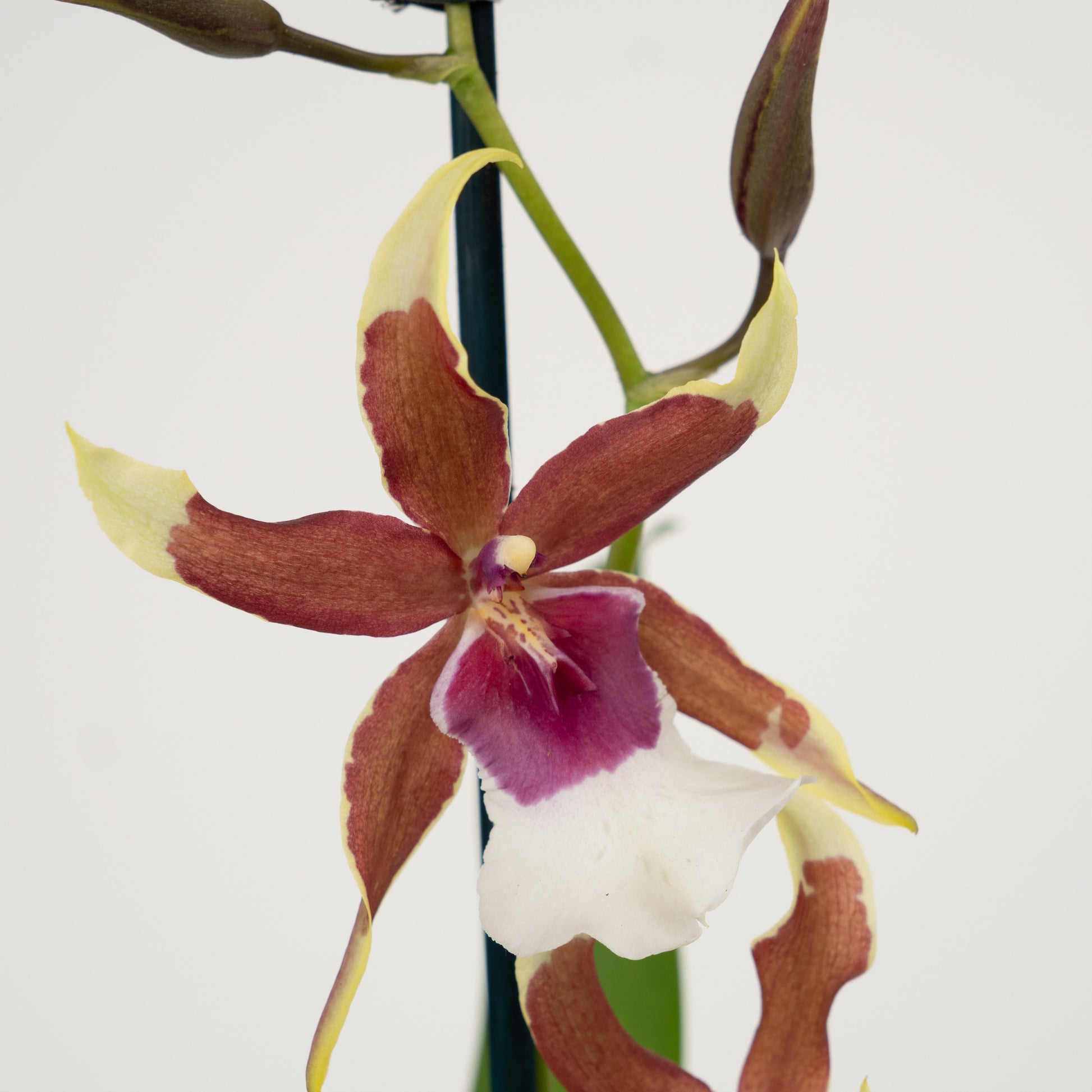 This elegant orchid presents beautifully sculpted “dancing lady” blooms in a rich, dusky wine tone, giving it an instantly luxurious and dramatic feel. Each flower is delicately finished with soft lemon-yellow tips and a mauve-toned centre, creating a striking contrast that enhances its graceful silhouette. With its refined colouring and classic Oncidium form, this variety stands out as a sophisticated showpiece for any orchid lover.